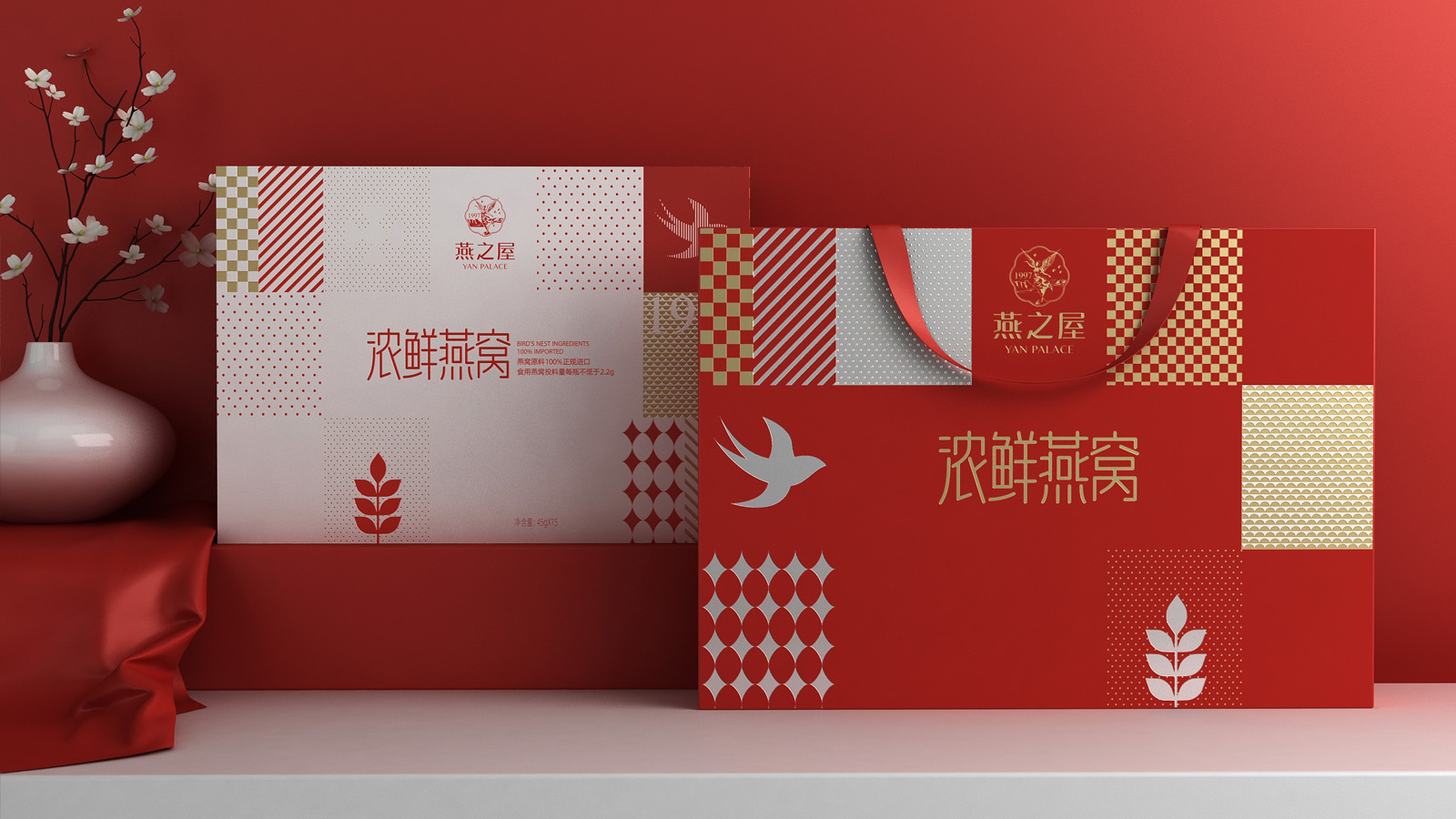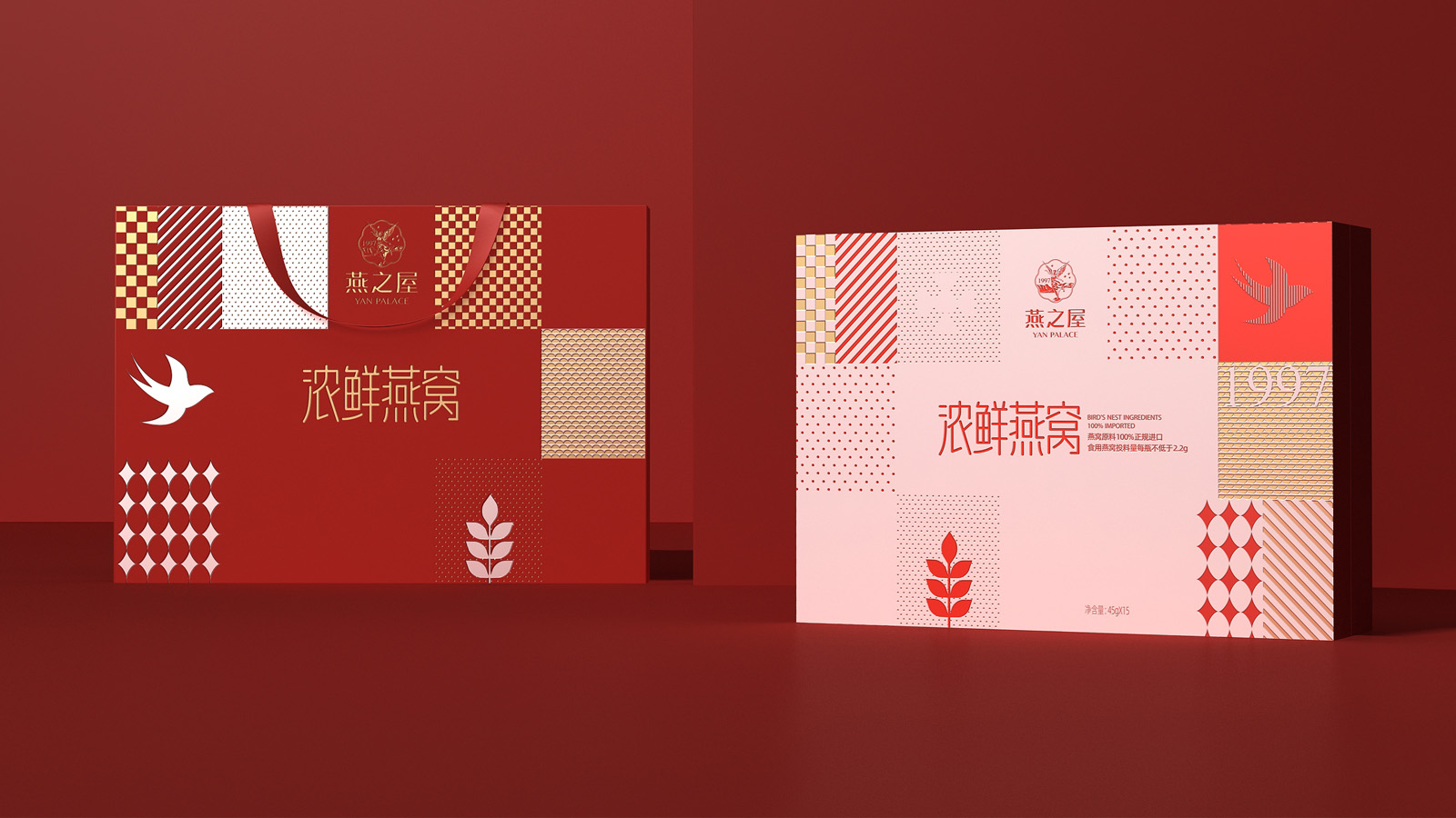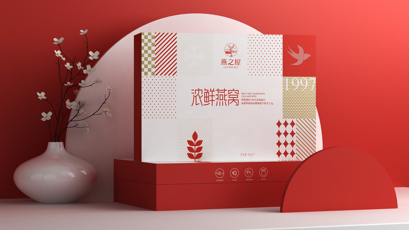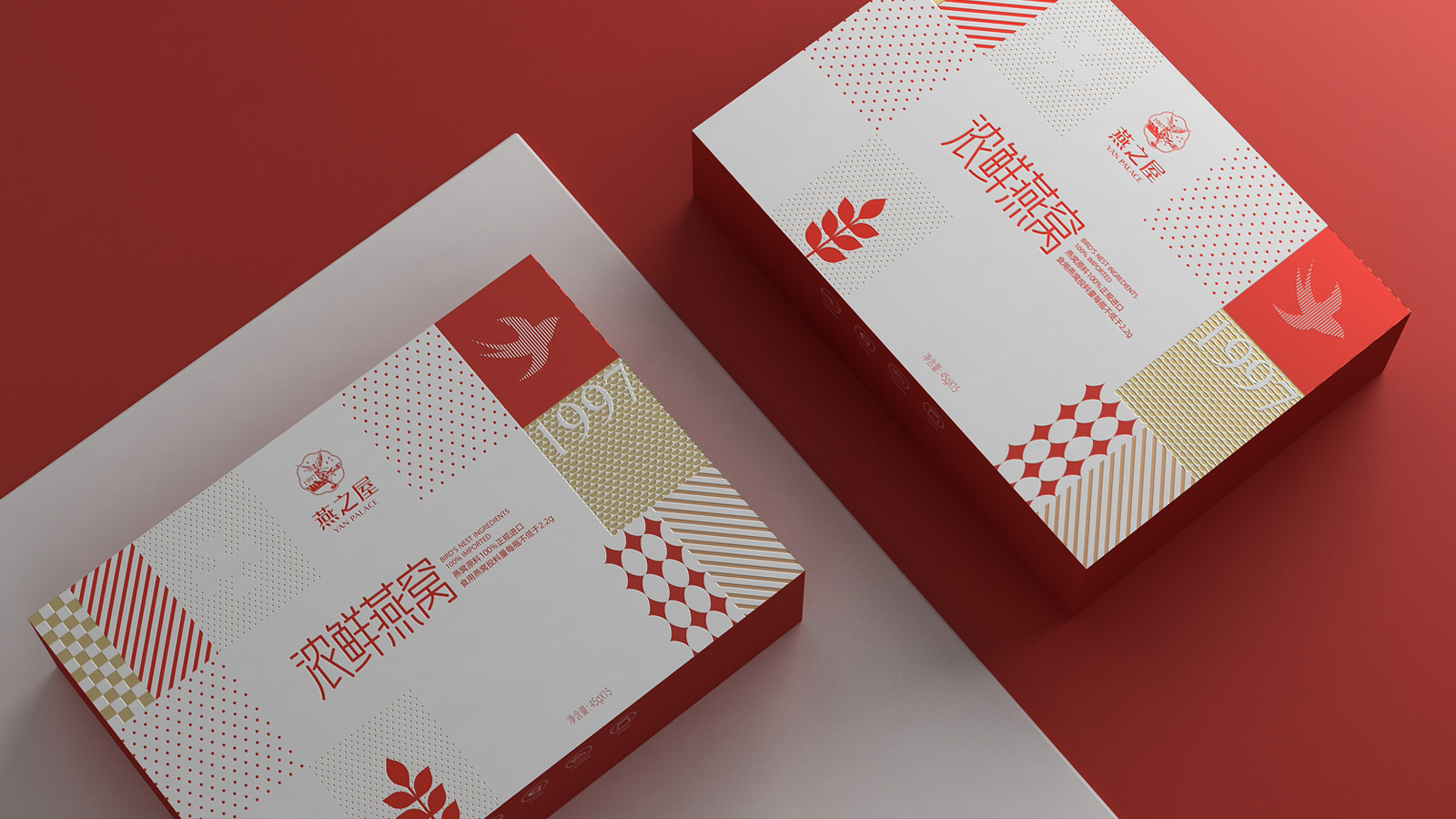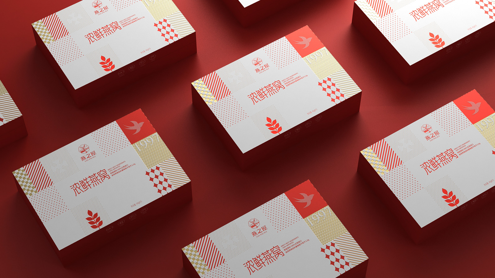 畫面的中的燕子代表著產(chǎn)品屬性,1997是燕之屋的成立時間,表達了燕之屋在燕窩領域行業(yè)已經(jīng)深耕了23年,經(jīng)典的波點,方格是對燕之屋的印象具象化表現(xiàn),主要是為了烘托氛圍感,葉子代表著無添加,純天然,表達了燕之屋用心做產(chǎn)品的匠心精神。