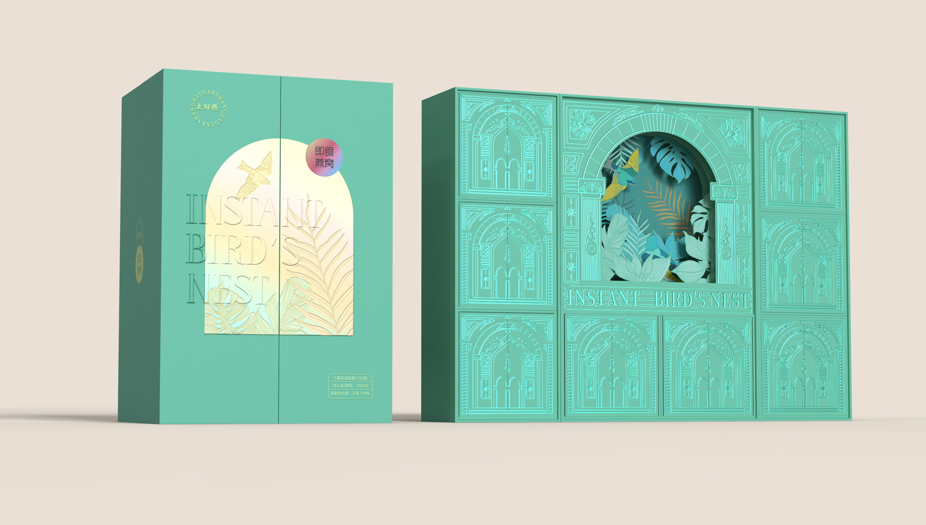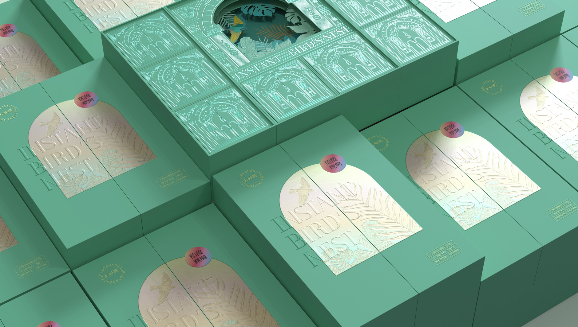 上好燕即食燕窩禮盒,是智圓行方為葛蘭瑞克在山姆會員店特渠開發(fā)的禮盒產(chǎn)品,設計師為其定義主題為“熱帶植物的靜謐從容”,以清新淡雅的薄荷綠,詮釋春夏的活潑以及優(yōu)雅健康的形象,體現(xiàn)“下午茶的優(yōu)雅時光”。